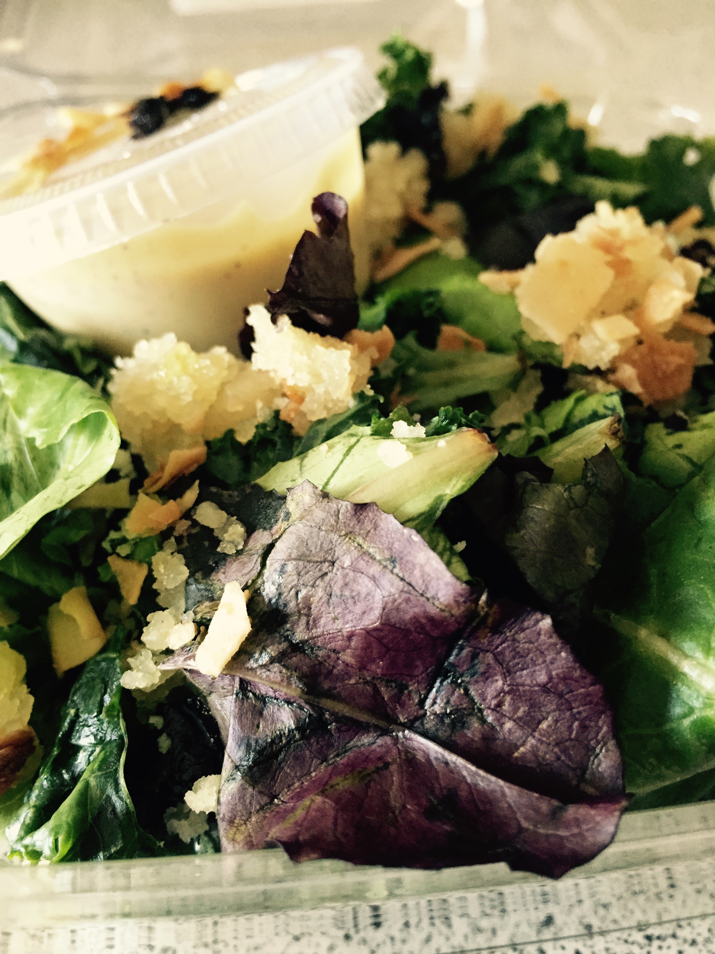 Breakfast on Day 2 was a container of something (looked like tapioca), in almond milk. I love tapioca pudding. This wasn’t tapioca pudding. You can just see it there to the right of the red bottle of juice. I abandoned breakfast in favour of a juice, again, because of textural issues. Lunch was a salad. These take me an enormous amount of time and energy to eat. They are tasty. They ooze health, vitamins and energy. I’m a person who is used to tuna sandwiches or left over pasta. I struggled, but I ate it.