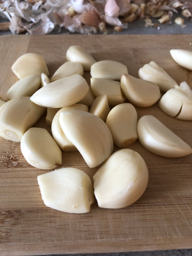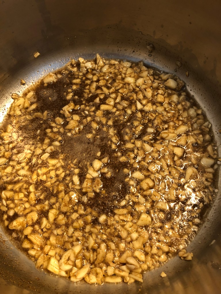 Heat your oil in your trusty pot. Over medium heat, add you chopped garlic and TEND TO IT. You want it cook, but you don’t want it to burn. After spending the time peeling and chopping two heads of garlic you don’t want to ruin your hard work by burning it. Tending to it means you stand there, wooden spoon in hand and stir it with love until it’s just right. Just right means just on this side of turning golden brown.