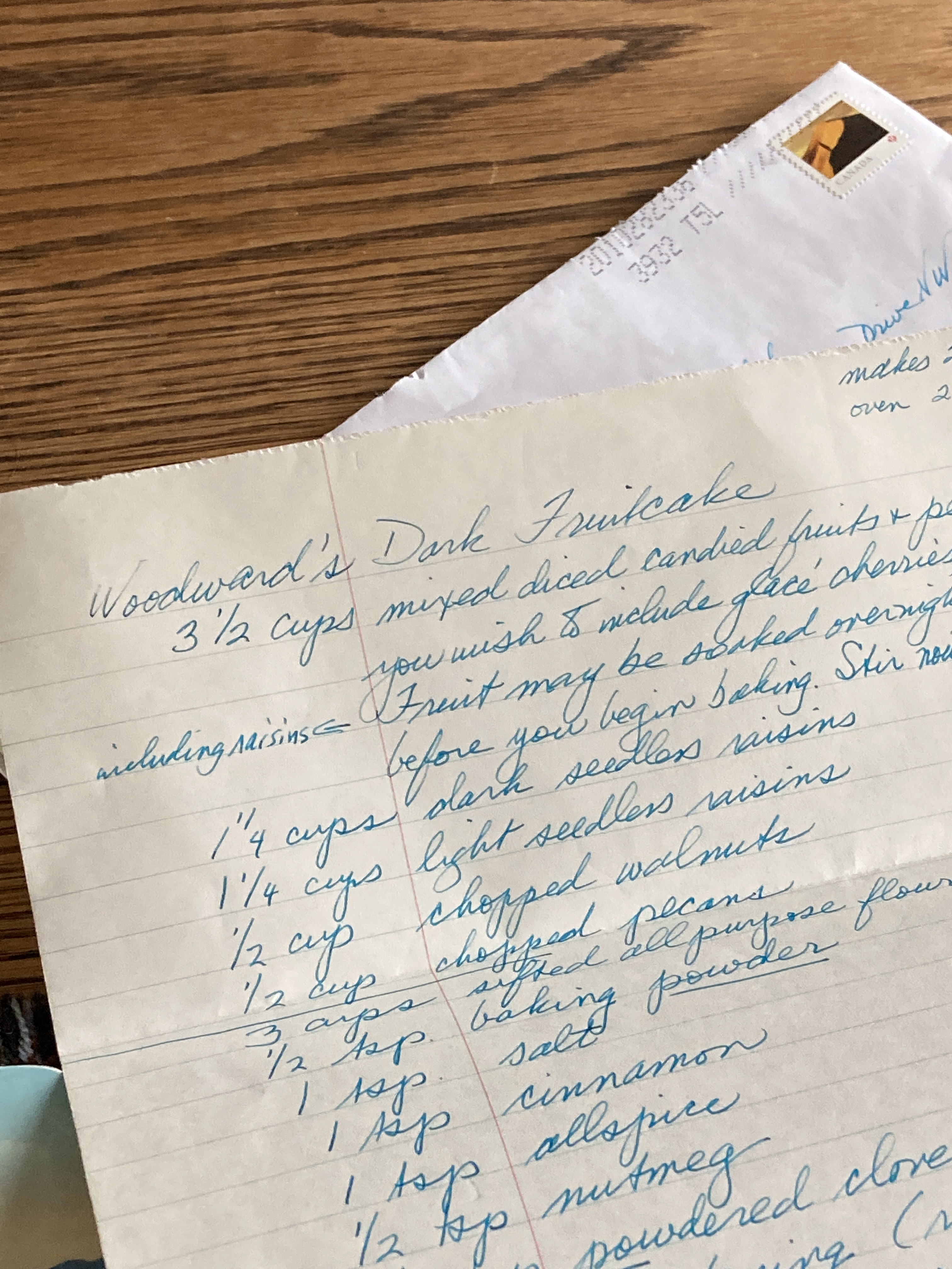 When Eileen posted about the dark fruitcake, I asked for, and received, a beautifully hand-written copy of the recipe in the mail. The whole exchange was so old school and delightful and nostalgic, for a moment I thought I would hand copy ALL my recipes, electronic or otherwise. I have recipes scribbled on scraps of paper attached to our fridge, in cookbooks, in notebooks, on Pinterest, this blog, in my purse, pockets, and in several cookbooks I started typing and then abandoned. The idea became overwhelming. It was ditched as quickly as it was thought.