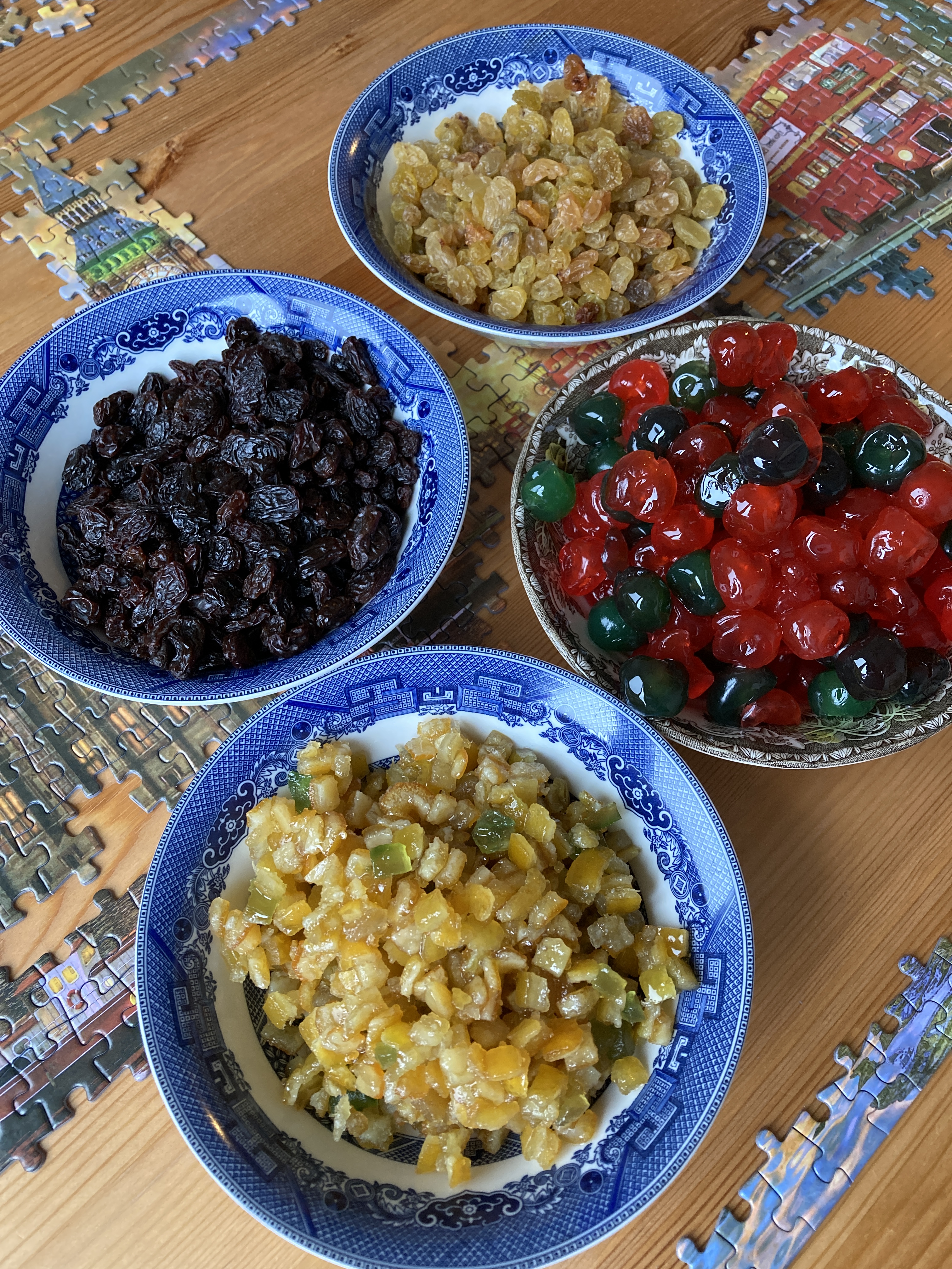 As for booze in the assorted peel, cherries and raisins…. not an option. You MUST put some in. I soaked mine overnight in one cup of brandy. When I drained the fruit, I captured the boozy juicy mix thinking it would be a treat. It came out so thick and syrupy in ended up down the drain and into the North Saskatchewan river. There may be a few happy fish or ducks down there in the river valley.