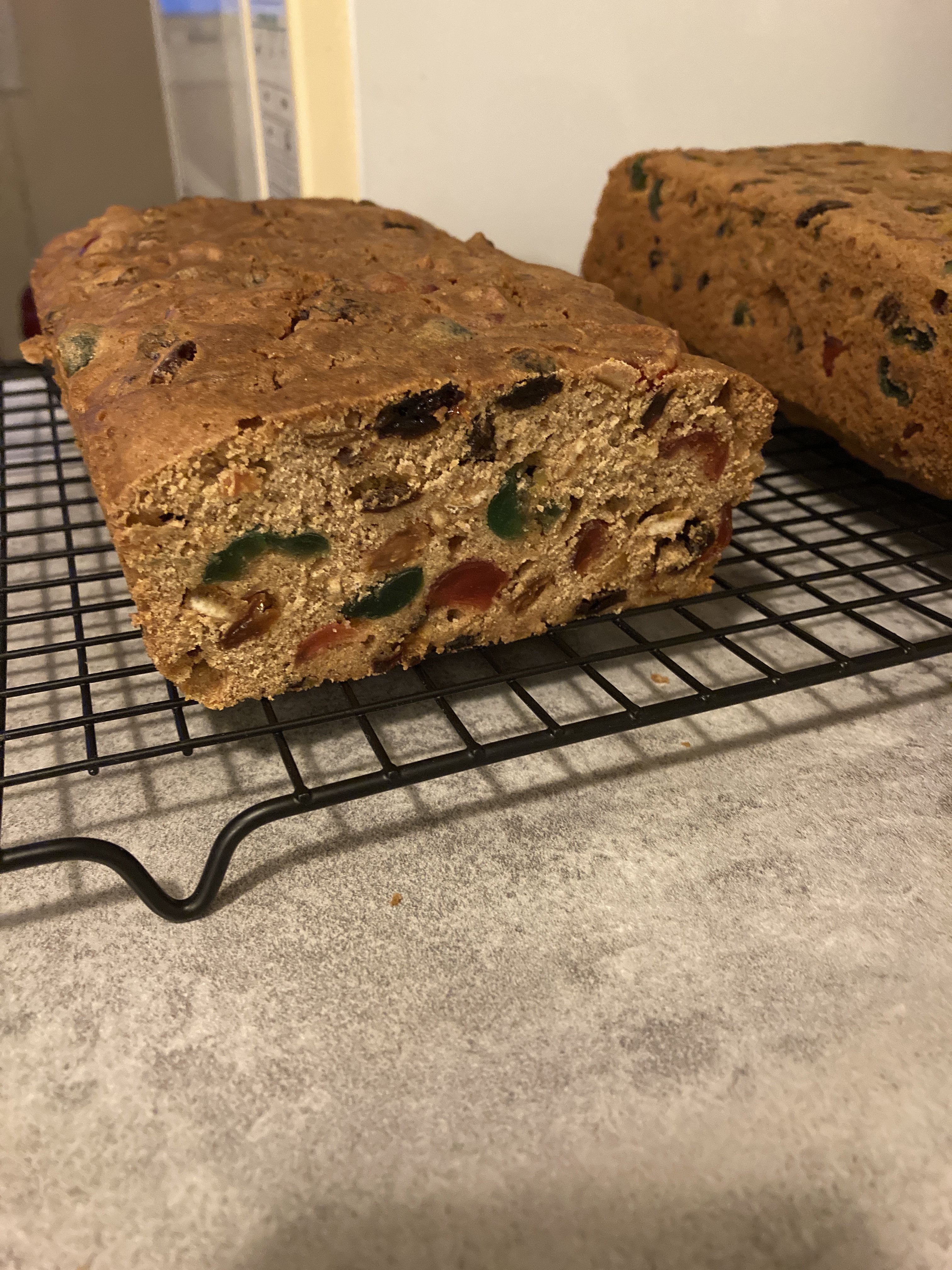 The cakes turned out perfect. Although still not quite my Mom’s version, it is the closest I have come. I also ate a sample as soon as it was cool enough to slice. Generally I will keep fruit cake wrapped and stored until Christmas time.
